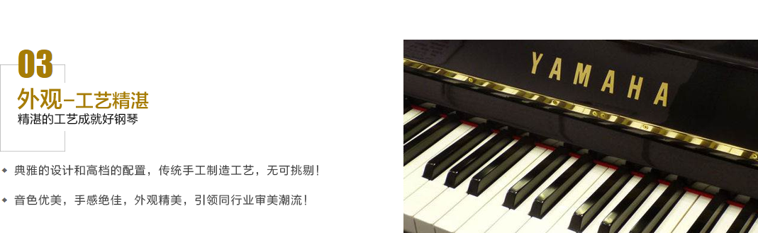 YAMAHA的鋼琴制造工藝始于一個世紀前,一百多年來,YAMAHA不僅繼承和奠定了制造優(yōu)質鋼琴所應具備的傳統(tǒng)技術,而且還通過不斷的探索研究,在傳統(tǒng)技術上開拓了新的領域,為了迎合流行音樂的發(fā)展。YAMAHA的設計風格逐步趨向于適應流行音樂化的趨勢。